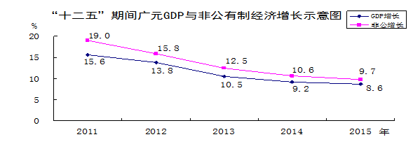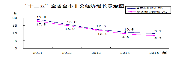 ——速度持续较快。2015年,全市非公有制经济增加值增长9.7%,比全省(8.3%)快1.4个百分点,居全省第6位。“十二五”期间全市非公有制经济增加值年度增长速度分别快于全省1.2、0.8、0.4、1.1和1.4个百分点,分别快于同时期经济增长速度(GDP)3.4、2.0、2.0、1.4和1.1个百分点。五年年均增长13.5%,快于全省年均增速1.0个百分点,快于同时期经济(GDP)年均增长速度2.0个百分点。