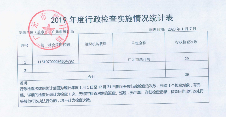 1.本部门2019年度行政检查总数为29次。