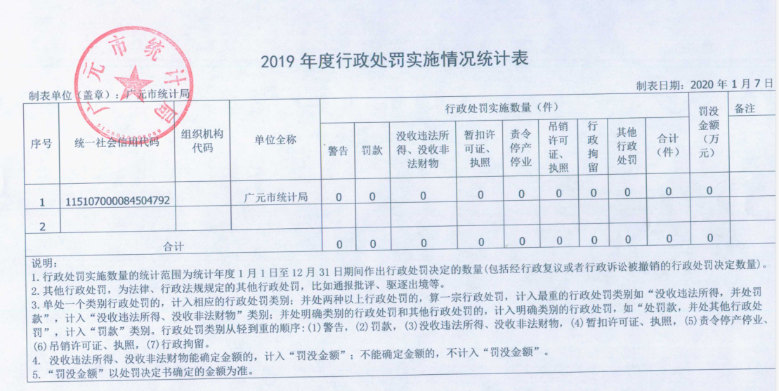 1.本部门2019年度行政处罚总数为0 宗,罚没金额0 元。