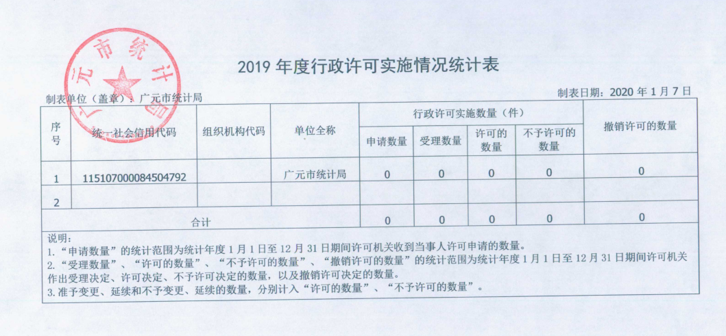 1.本部门2019年度行政许可申请总数为 0 宗,予以许可 0宗。