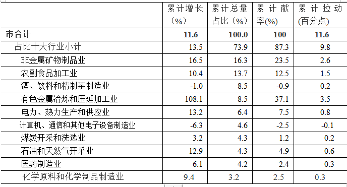 重点行业对增长拉动较强。1-5月增加值占比前十个行业增加值占全市规上工业73.9%,对全市规上工业增长贡献87.3%,拉动全市增长9.8个百分点。其中,有色金属冶炼及压延加工业增长108.1%,贡献率为37.1%,拉动增长3.5个百分点;非金属矿物制品业增长16.5%,对规上工业增长的贡献率为23.5%,拉动规上工业增长2.6个百分点;农副食品加工业增长10.4%,贡献率为12.5%,拉动增长1.5个百分点。