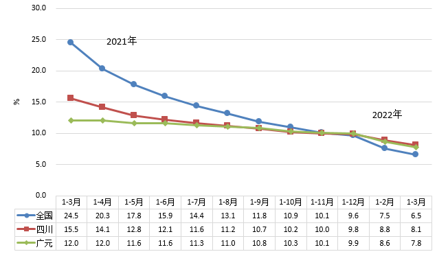 规上工业增速高于全国低于全省。一季度,全市规模以上工业增加值同比增长7.8%,高于全国增速1.3个百分点,低于全省0.3个百分点,居全省第12位,较1-2月上升2位,川东北第1位。其中,本月增长6.5%,居全省第15 位、川东北第2位。