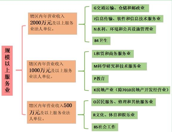 辖区内年营业收入2000万元及以上服务业法人单位。包括:交通运输、仓储和邮政业,信息传输、软件和信息技术服务业,水利、环境和公共设施管理业三个门类和卫生行业大类。