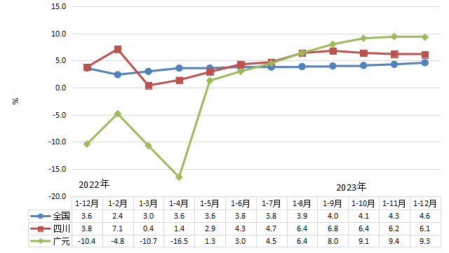全国、四川和广元规模以上工业累计增速对比图