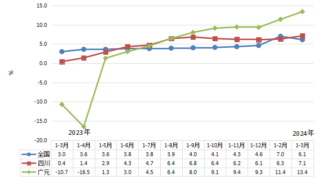规上工业增速位次双提升。一季度,全市规上工业增加值增速13.4%,比去年全年和今年1-2月分别提高4.1和2.0个百分点,保持1-2月全省第6位、川东北第1位,比去年全年上升1位。增速分别高于全国(6.1%)、全省(7.1%)7.3、6.3个百分点。