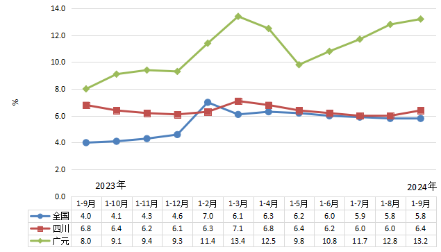 全国、四川和广元规模以上工业累计增速对比图