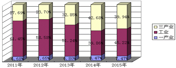 轻重工业发展渐趋合理。轻重工业比重由2010年30.0:70.0调整为2015年的41.3:58.7,轻工业比重提高了11.3个百分点。