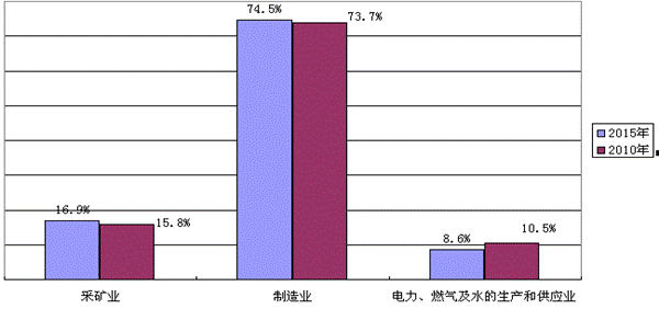 行业涵盖面扩大。2015年规模以上工业涉及34个行业大类,行业涵盖面为82.9%,比2010年增加3个行业大类,行业覆盖面扩大3.4个百分点。