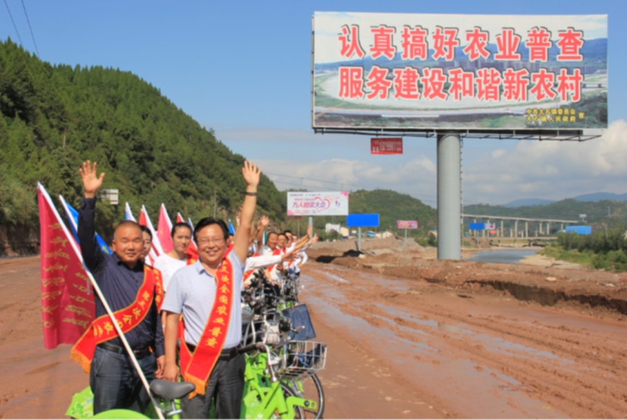二是周密部署,亮点纷呈。围绕“农业普查福到农家”活动主题,9月21日,市农普办携手市统计局、利州区统计局不仅在广元城区和大石场镇搭设宣传点联合开展宣传普及统计知识,还举办开放日进乡村活动。市区两级抽调20名职工组成骑行宣传队,骑行队员佩戴绶带,自行车插挂彩旗,精心设计线路从市区主干道骑行至大石镇并深入农户家中宣传农业普查和精准扶贫知识。绿色的自行车、红色的绶带、五彩的旗子随风飘扬,成为一道独特靓丽的风景线,吸引了大量群众驻足观看。