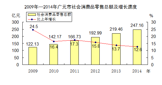 市场销售平稳增长。全年社会消费品零售总额247.16亿元,比上年增长12.6%。其中,限额以上单位消费品零售额73.81亿元,增长12.6%,占社会消费品零售总额的29.9%。