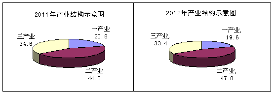 2012年,三次产业结构由上年的20.8:44.6 :34.6调整为19.6:47.0:33.4(见下图),第二产业占比上升了2.4个百分点,第一产业和第三产业占比分别下降了1.2和1.2个百分点。其中,工业增加值占GDP的比重由上年38.6%提高到40.5%,提升了1.9个百分点。
