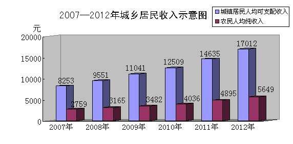 城乡居民收入稳步增加。城镇居民人均可支配收入17012元,同比增加2377元,增长16.2%(如下图),分别比全国、全省快3.6和2.7个百分点,居全省第4位。总收入中,工资性收入12189元,经营性收入3136元,财产性收入603元,转移性收入2502元。农民人均纯收入5649元,同比增加755元,增长15.4%,分别比全国、全省快1.9和1.2个百分点,居全省第4位。其中:工资性收入2725元;家庭经营性收入2477元。