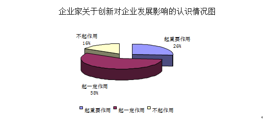 (四)企业家对企业创新活动的认识。在创新对企业生存和发展影响认识方面,企业家认知度也存在很大的差异。被调查的722位企业家中有191位认为创新对企业生存和发展起了重要作用,占被调查企业家的26.4%;有412位认为起了一定的作用,占57.1%;有119位认为不起作用,占16.5%。