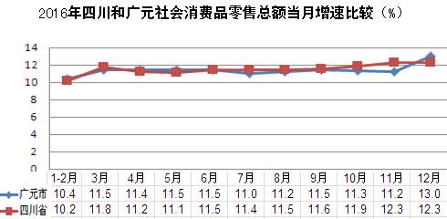 2016年,面对经济下行压力持续加大的宏观经济形势,广元市积极开展“惠民购物全川行动”、“川货全国行”、“万企出国门”活动,促进了消费品市场的平稳发展。全市社会消费品零售总额突破300亿、达到331.07亿元,比上年增长11.6%,超全年目标1.07亿元、0.6个百分点,增速居全省第13位,比上年提升1位。