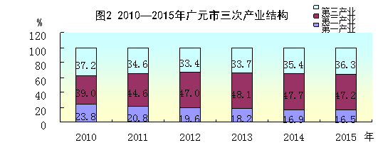 转型升级成效显现。三次产业结构由上年的16.9:47.7:35.4调整为16.5:47.2:36.3。服务业增加值占GDP的比重比上年提升0.9个百分点。物流、网购、电子商务等新产业、新业态、新商业模式发展迅速,限额以上单位通过互联网实现的商品零售额比上年增长13.8%,快递企业业务收入比上年增长40.1%。城乡居民收入增长快于同时期经济增长,城乡居民收入差距由上年的2.69:1缩小为2.64:1。