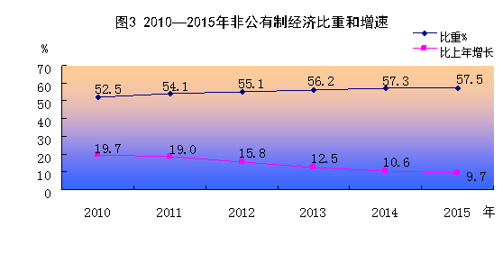 非公有制经济发展较好。全年非公有制经济增加值348.12亿元,比上年增长9.7%。其中,第一产业增加值32.81亿元,增长5.7%;第二产业增加值201.53亿元,增长11.5%;第三产业增加值113.78亿元,增长7.9%。非公有制经济增加值占GDP比重为57.5%,比上年提高0.2个百分点,其中民营经济(个体私营经济)增加值335.24亿元,增长9.8%,占GDP的比重为55.4%,比上年提高0.3个百分点。