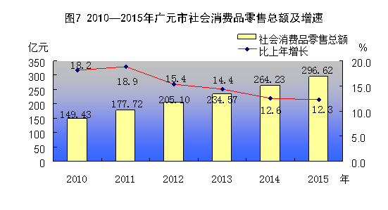 消费市场平稳增长。全年社会消费品零售总额296.62亿元,比上年增长12.3%。其中,限额以上单位零售额87.54亿元,增长14.5%,占社会消费品零售总额的29.5%。