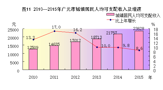 城乡居民收入持续增加。全年全体居民人均可支配收入15552元,增长9.3%。按常住地分,城镇居民人均可支配收入23628元,比上年增加1871元,增长8.6%,人均生活消费支出15250元;农村居民人均可支配收入8939元,比上年增加842元,增长10.4%,人均生活消费支出7397元。