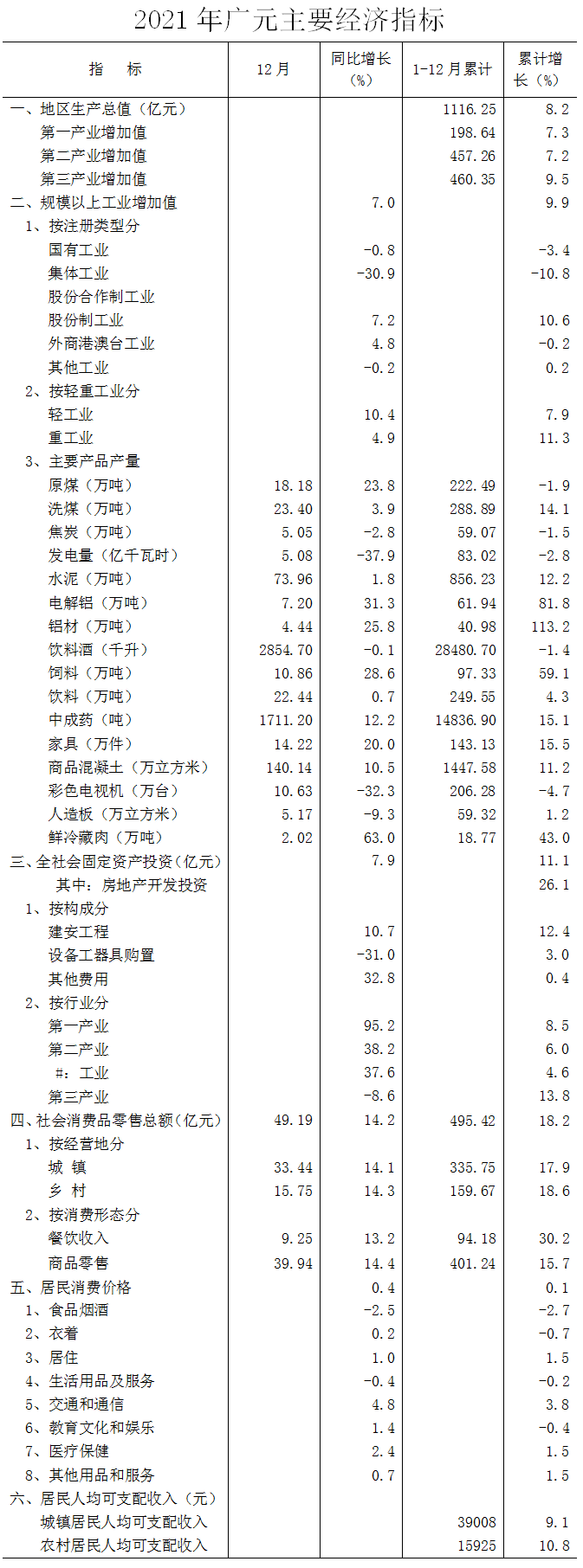 2.物价、城乡居民收入、粮食产量和畜禽数据由国家统计局广元调查队提供;就业数据由市人力资源和社会保障局提供。