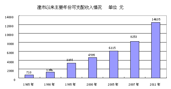 2011年,全市城镇居民人均可支配收入达14635元,比上年净增加2126元,为建市以来年均增量最多的一年。城镇居民人均可支配收入是建市的20.6倍,是“十五”末的2.4倍,比2007年增长77.3%,五年时间翻了一番多(如下图 )。