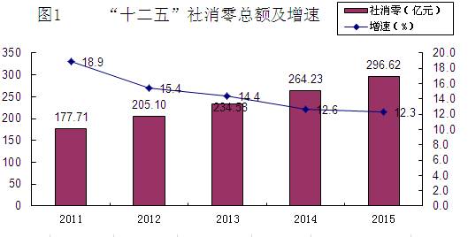 (四)限额以上单位发展良好。一是单位快速增加。2015年末,全市限额以上单位395户,比2010年增加340户,年均增长48.3 %。二是总量急速扩张。2015年限额以上单位零售额87.54亿元,比2010年增长了7.8倍,年均增长50.8%。三是贡献迅猛提升。2015年限上零售额占社消零总额的29.5%,比2010年提高了22个百分点;对社消零的贡献率达34.8 %,比2010年提升27.7个百分点。四是实力逐步壮大。2015年销售(营业)额1千万至5千万的单位198户,比2010年增加180户;销售(营业)额5千万以上至1亿元的单位24户,增加21户;销售(营业)额1亿元以上单位19户,增加12户。五是运行质量较好。“十二五”期间,在总量壮大的同时,企业运行质量也逐步提高。2015年,限上企业主营业务收入突破118.8亿元,是2010年的2倍,年均增长14.6%;利润总额2.59亿元,是2010年的1.6倍,年均增长10.2%;利税总额6.92亿元,是2010年的1.9倍,年均增长14.0%。