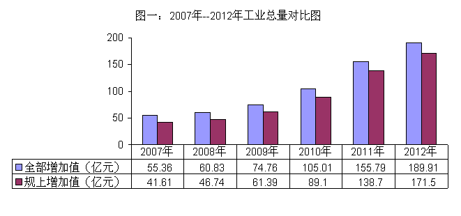 2012年,全部工业增加值189.91亿元,比上年净增34.12亿元。其中,规模以上工业增加值达到171.5亿元,比上年净增32.8亿元。规上增加值总量实现新突破,在全省排位结束了自1998年实行规模以上统计以来居第18位以后的局面,首次进入全省第17位。