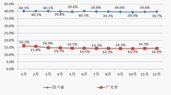 图三 四川与广元限额以上零售额占社会消费品零售总额比重示意图