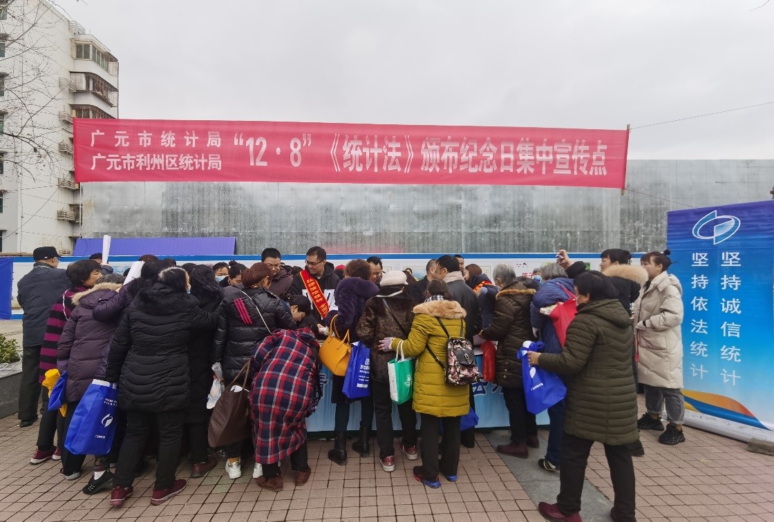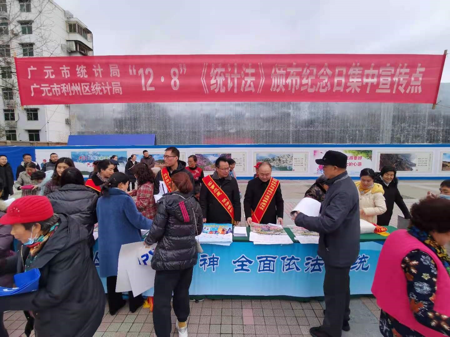 12月8日,十大网络赌博网站排行联合利州区统计局在苴国广场集中开展了“12.8” 《统计法》颁布纪念日宣传活动。市统计局副局长欧明宇,利州区统计局相关领导及市区两级工作人员共计20余人参加了此次活动。